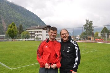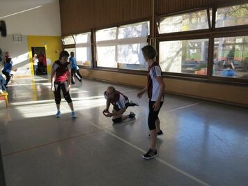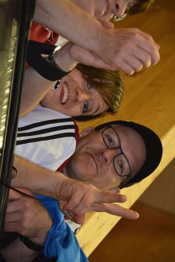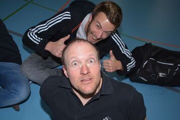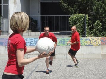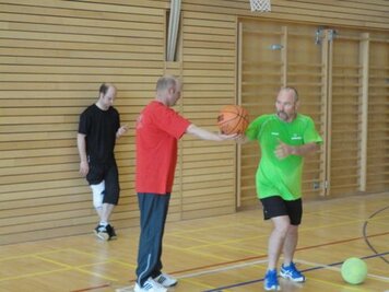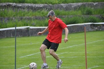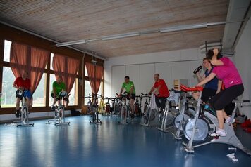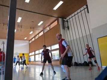 Mit einem guten Frühstück gestärkt und einem Aufwärmprogramm mit Dani und den Aktiven starteten wir in unseren Trainingsmodus. Mit dem 3-Spiel brachten wir uns in Stimmung. Leider konnten wir nur in dieser Lektion von Hitschs Schiedsrichter-kenntnissen profitieren, schade. Für die 2. Lektion kündete uns Marco einen Gastreferenten an. Wer, was, wo? rätselten wir. Unser Instruktor entpuppte sich als Hänse, der uns in die Feinheiten des Spinnings einführte. Nach gefühlten 3 Pässen, einigen Schlucken an Getränken (Nachschub hatten wir dank eines Fahrers, der sich auf die Seite des Verpflegungsteams schlug) und durchnässten T-Shirts brauchten wir dringend schon vor dem Mittagessen unsere erste Dusche!