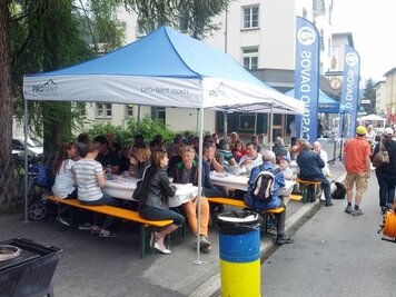Nach Turnierende und Rangverkündigung machten wir eine Runde auf dem Festplatz und konnten die Beachvolleyballer vom TV Davos ein bisschen anfeuern, nachdem sie uns so lautstark in der Halle unterstützt haben.